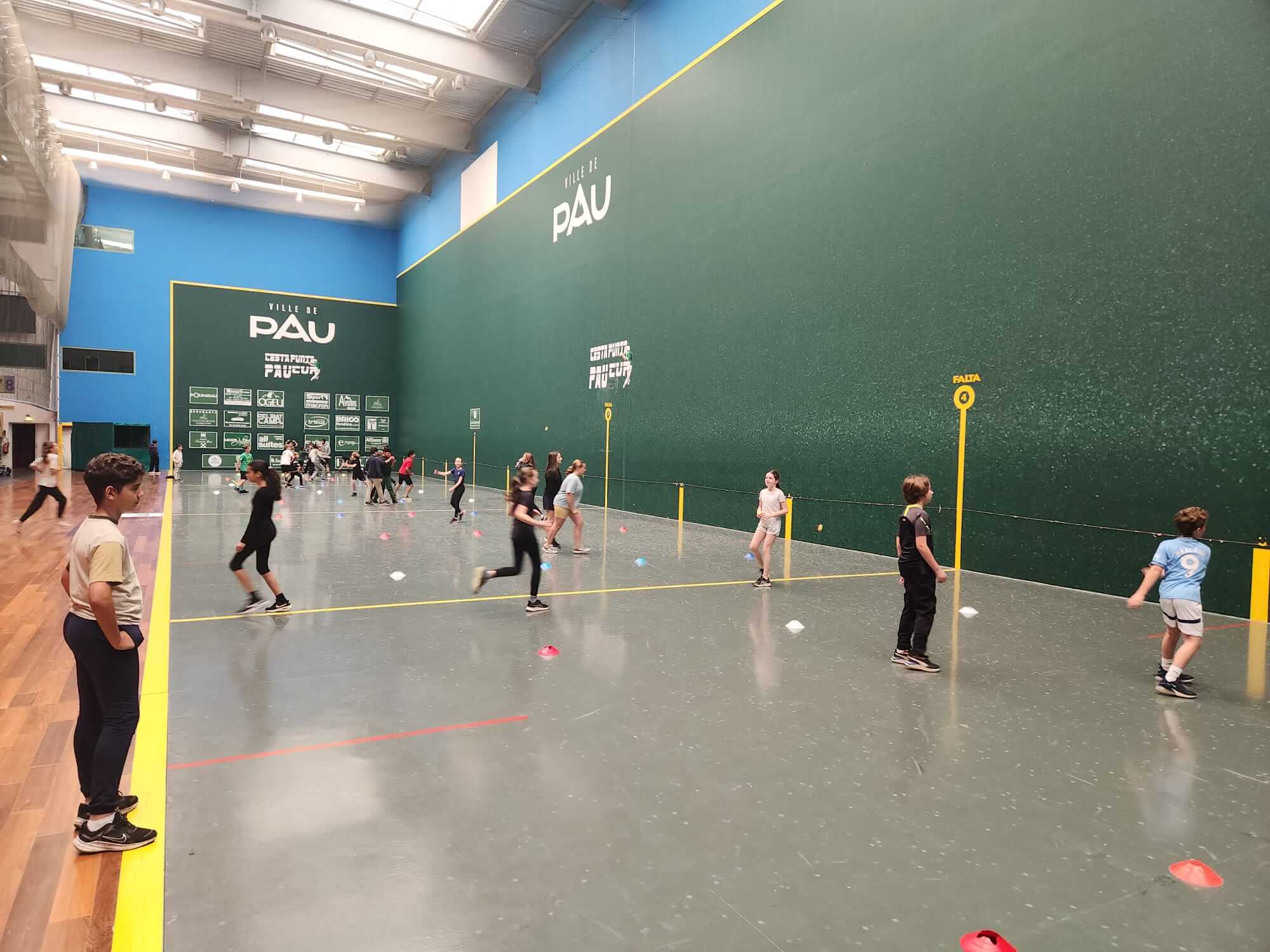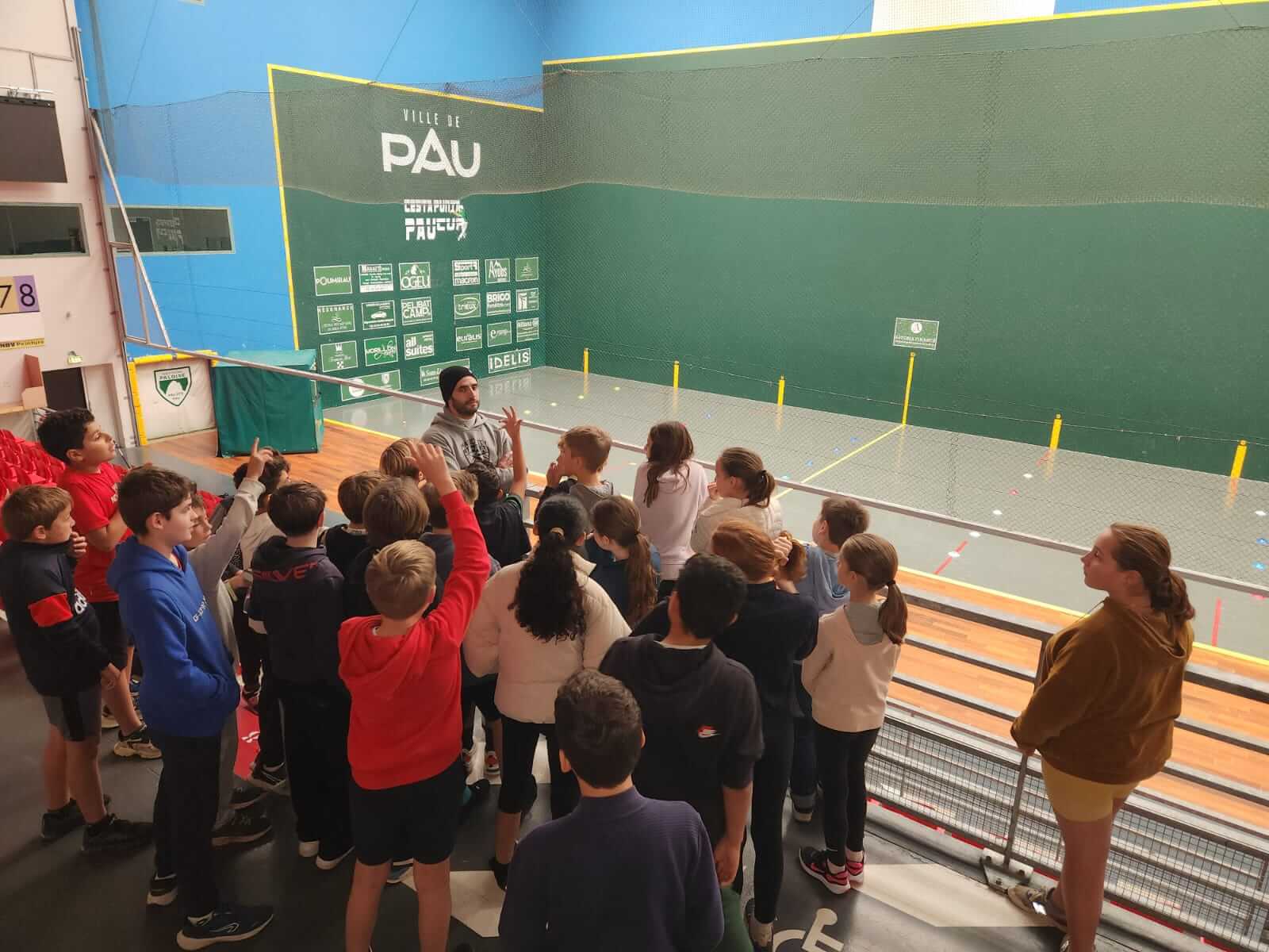 Les élèves de la classe de 6e2 ont été accueillis au Jaï Alaï par M. Pierrou de la Section Paloise Pelote et M. Jean Olaran, champion du monde de Cesta Punta.
